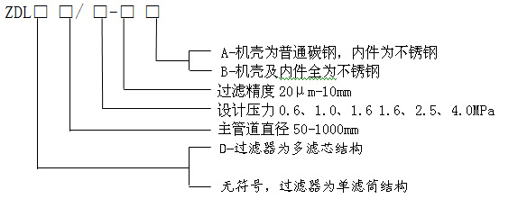举例:ZDLD350/0.2-0.6A,是指主管道公称直径DN350的多滤芯式反冲洗过滤器,其过滤精度为0.2mm,设计压力为0.6MPa,壳体为碳钢,内件为不锈钢。
